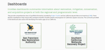 EcoAtlas dashboards summarize information about restoration, mitigation, conservation, and acquisition projects at both the regional and programmatic level. Check out the WRP’s dashboard online here: